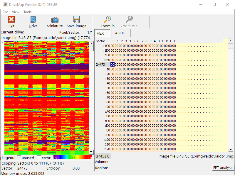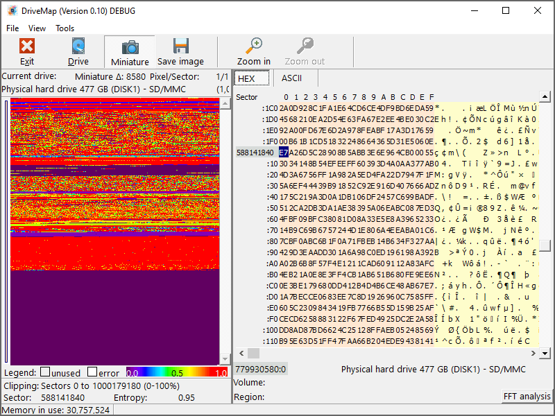 Mit DriveMap können Sie die Datenentropie einer Festplatte über alle ihre Sektoren hinweg untersuchen. Eine Mausbewegung lässt das Programm den Inhalt des aktuellen Sektors in einem benachbarten Fenster anzuzeigen. Sie können Ihr gesamtes Laufwerk auch als 400 × 400 Pixel große Miniatur-Bitmap anzeigen lassen. Auf diese Weise können Sie Laufwerkseigenschaften schnell erfassen, deren Erkennung mit anderen Methoden, z. B. DiskExplorer oder RAID Reconstructor, normalerweise viel mehr Zeit in Anspruch nehmen würde.