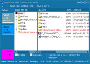 If you don't see the files you are looking for at all, go back to the Select File System screen and try other file system entries (if there are any). If you still cannot find your data, click on the purple Level rectangle in the lower-left corner. Here you can increase the thoroughness with which GetDataBack scans the drive. Possible are levels * up to ****. If you still cannot find your data, send us a snapshot of your recovery, along with a short description of what happened to your drive.