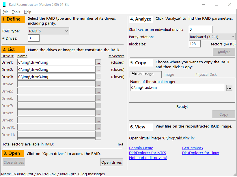 RAID Reconstructor rettet gebrochene RAID-0- und RAID-5-Arrays, bestehend aus 2 bis 16 bzw. 3 bis 16 Festplatten. Bei RAID-5-Arrays darf ein Laufwerk fehlen.