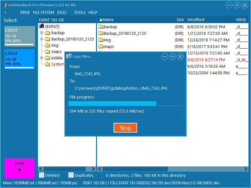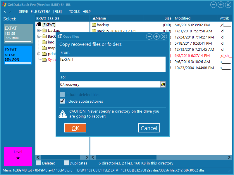 Asegúrese de tener suficiente espacio en la «unidad buena» para almacenar los datos recuperados. También puede copiar los datos recuperados a una red LAN si tiene acceso a una. El equipo en el que ejecuta GetDataBack puede tener cualquiera de los siguientes sistemas operativos: Vista, Windows 7, Windows 8, Windows 10, de 32 bits o de 64 bits.