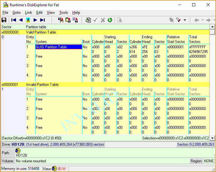 Puede utilizar cualquier versión de DiskExplorer. Al iniciar el sistema, la pantalla debería tener un aspecto similar al siguiente. DiskExplorer muestra automáticamente el sector 0 del primer disco duro (HD128, a.k.a. DISK0).
