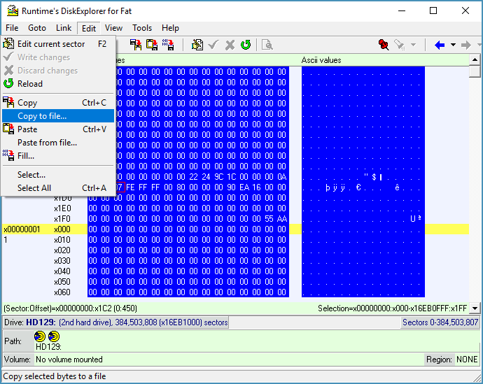 Ahora está viendo su disco duro en Hex. A continuación, seleccionamos los datos que queremos copiar. Si desea copiar todo, cliquee en «Edit → Select All» o presione CTRL-A.