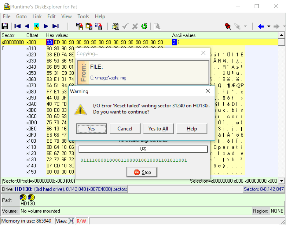 Si recibe un error «Restablecimiento fallido (Reset Failed)» al inicio de la copia, Windows impide que el programa escriba en la unidad de destino. Puede resolver el problema ejecutando DiskExplorer desde el Runtime Live CD o sobrescribiendo primero el sector 0 de la unidad de destino con ceros.