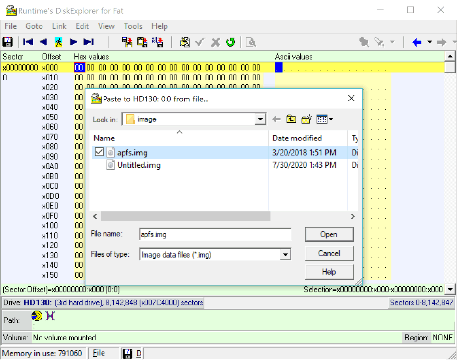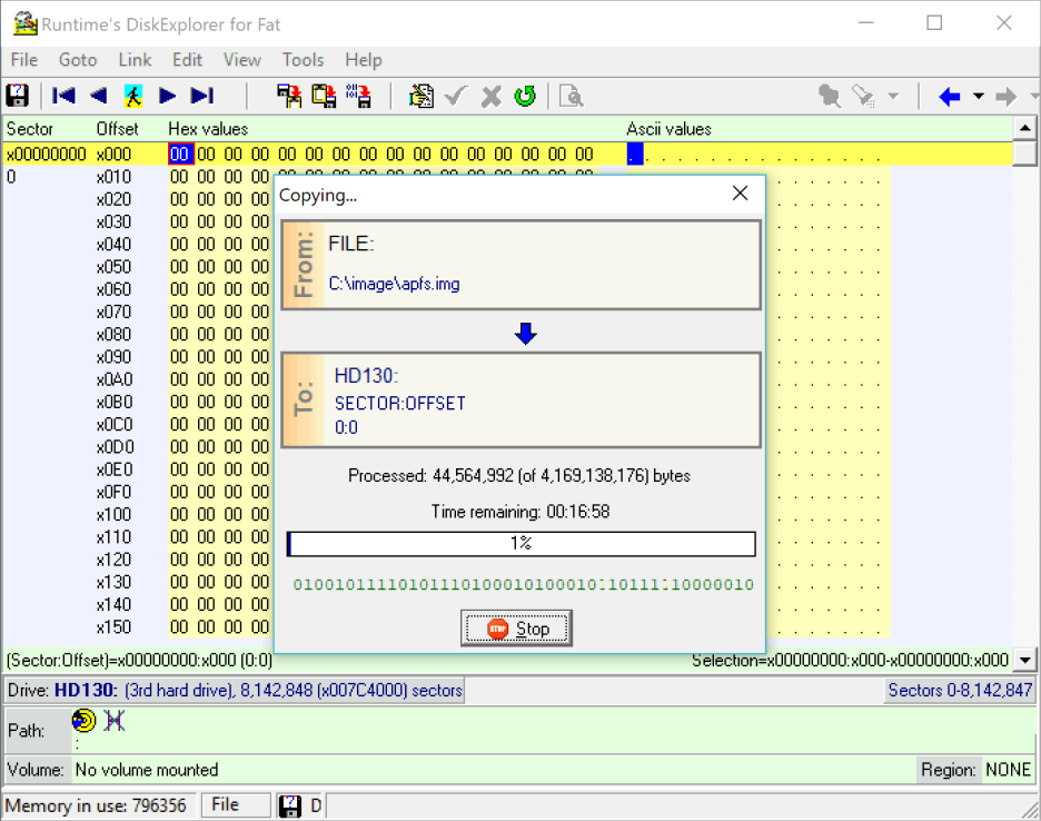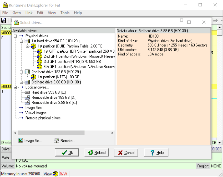 En el siguiente ejemplo, escribiremos un archivo de imagen de 4 GB en una memoria USB vacía de 4 GB. La unidad de destino de 4 GB se conecta a un puerto USB y DiskExplorer la reconoce como tercera unidad (HD130).