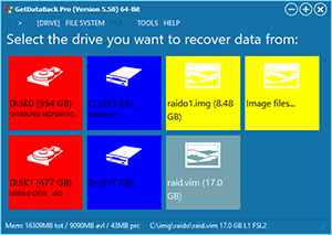 If, in particular circumstances, you wish to add logical drives (C:, D:, etc.) to the Select Drive screen, you can do so by going to TOOLS->Settings->Miscellaneous and check Show logical drives. That adds a blue tile to the screen. Click on it, and all compatible logical drives appear as blue tiles. The screenshot on the right side shows red tiles for physical drives, blue tiles for logical drives, and yellow tiles for images and virtual images.