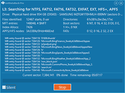 The progress window shows information about the ongoing recovery process. At this point, GetDataBack is searching for file systems on your drive, and the recovery is between the Select Drive and the Select File System screen.