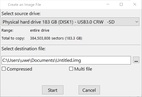 Select the drive you want to copy from and the file you want to copy to. If you check "Multi file", the image will be split in files of 650 MB.