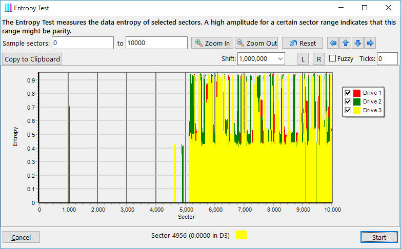 The x-axis represents the sectors defined in "Sample sectors", 0-10,000. The y-axis represents the entropy of the data of a sector. The graphs for the 3 drives are drawn over each other in different colors. First drive drawn is Drive 1 (red), Drive 2 (green), Drive 3 (yellow). Move left (down) with the "L" button, right (up) with the "R" button. When pressing "L" or "R", the sector numbers shift by the value set in "Shift", 1,000,000. You can zoom in and out, or reset. As the last drawn drive, Drive 3 (yellow), overlaps the other drives, you can hide a drive by un-checking its checkbox to the right of the graph.