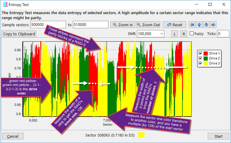 RAID Reconstructor makes use of entropy values in order to find the RAID parameters. The Entropy test displays the entropy of the data of each sector.