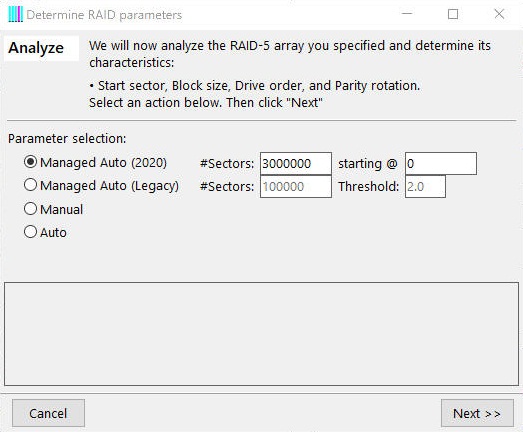 The Analysis Wizard The wizard's first screen asks how you want the analysis to proceed. Select "Managed Auto (2020)". This will perform a pre-test in order to eliminate unlikely combinations. If you want to skip that pre-test and test all possible settings, select "Manual". If you want to run the pre-test and do not wish to review the parameters, select "Auto". "Managed Auto (Legacy)" mimics the pre-test used in previous versions of RAID Reconstructor. Click "Next".
