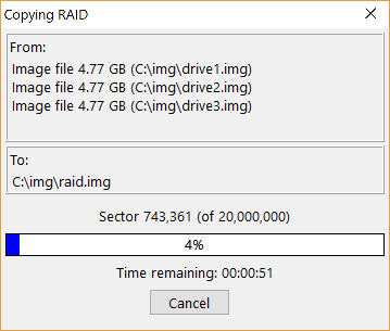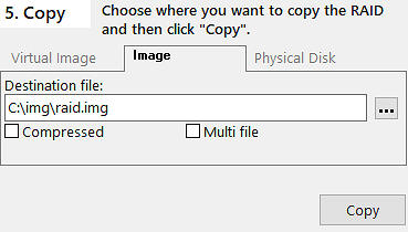 Specify the destination in the field "Destination file". Click on the button to the right of this field to open the file dialog. Enter an image file name, such as "c:\img\raid.img". The recommended file name extension is ".img", which will create a regular image file. A ".imc" extension will create a compressed image file. If you check the "Multi file" box the created image file be split into several files of 650 MB each. This might be necessary for file systems that do not support large file, such as FAT32. Click "Copy". The RAID now gets reconstructed. This can take a while.