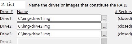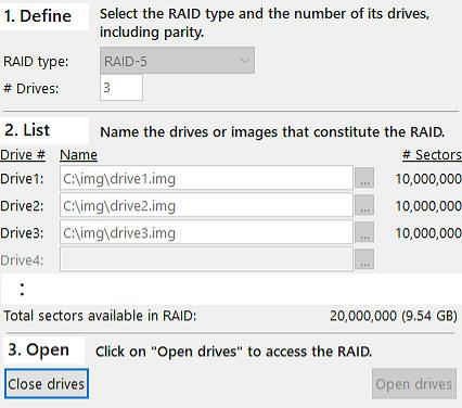 Example: RAID-5 array consisting of 3 image files, previously created on your local drive C:\img as drive1.img, drive2.img, and drive3.img.