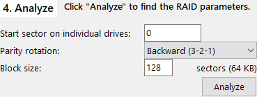 Analyze the RAID components and determine the correct drive order, block size and direction of rotation. This function is the brain of RAID Reconstructor. If you know the correct parameters you can enter them here and skip the analysis, going directly to (5) Copy. Otherwise click "Analyze" and start the analysis wizard.