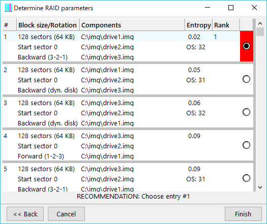 The list is showing no more than 10 combinations for each start sector. These 10 combinations were found to be the most likely ones. All others had been discarded. Each combination is checked if the resulting data "make sense". Each evaluation is given a value, called "entropy". The smaller this value is the more likely the entry represents the correct RAID parameters. The value of the best (first) entry should be at least 20% smaller than any other entry for a given start sector. If there is no such entry you will not get the recommendation above, but the warning "THIS RESULT IS NOT SIGNIFICANT!". If you get this message, most likely something is wrong. Additional information is provided if there was a file system on the broken RAID. Just below the entropy you can see an "OS:" followed by a number. RAID Reconstructor tries to parse the master boot record found in RAID sector 0. Depending on the integrity of the file system for the given combination it assigns two digits. They have the following meaning: The left digit is the number of partitions found. The right digits is the number of partitions that actually point to a valid file system boot record. Note: The information above is only provided if the RAID in question is a hardware RAID. Choose the desired entry (most probably the first one) and click Finish. This copies the selected parameters into the main screen. If you have a significantly small entropy (compared to others) and a high OS:xx value as in the example above, there is usually no doubt that this combination is the one you are looking for. If not you must look closer. If there are several combinations with almost the same values you might redo the analysis with a higher number of sample sectors (see above). You might also evaluate the "Start sector of the RAID" and run the XOR test tool. If you still do not get significant results you will have to determine the right ones with try and error: create a Virtual Image, check if you get your data with Captain Nemo or GetDataBack, try the next combination. If you still do not get your data you can order our RaidProbe service and we will determine the parameters for you.