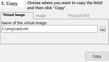 Specify the name of the virtual image. Click on the button to the right of this field to open the file dialog and enter a virtual image name, such as "c:\img\raid.vim". The name must have the extension "vim". Click "Copy". It takes less than a second to write the virtual image.