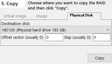 If any errors are encountered, messages are written into a file called "<program path>\log<n>.txt", where "<program path>" is the directory the RAID Reconstructor is located in and "<n>" is a number. From the main windows you can later check these messages by clicking Tools->View Log on the menu bar. Alternative 3) Copy To a Physical Disk IMPORTANT NOTE: DO NOT USE ANY OF THE SOURCE DRIVES AS A "TARGET". IF YOU COPY TO A PHYSICAL DRIVE, ALL DATA ON IT WILL BE DESTROYED. BE SURE YOU CHOOSE THE CORRECT DRIVE.