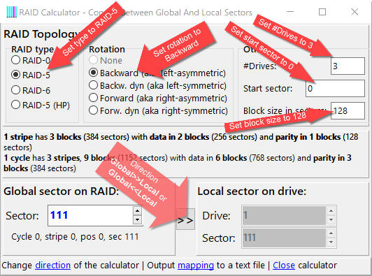 The RAID Calculator lets you map sectors between the RAID and its individual drives. For example if you want to know which sector on which individual member drive hosts sector 111 of a 3-drive backward RAID-5 with a block size of 128, you can find out like that: