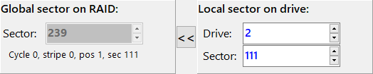 You can reverse the direction and find out which global sector originates from a given local sector. Type "2" and "111" into the field for the Local sector. The left-hand side shows you the result, 239, which is to be expected as the first 128 sectors are on drive 1 and the next 111 on drive 2, resulting in 239.