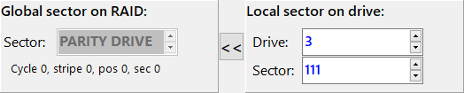 As determined by the RAID topology, sector 111 on drive 3 is in a parity block and as such can not be translated into a global sector. The left-hand side signals this with "PARITY DRIVE".