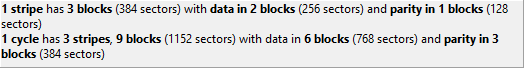 1 cycle has 3 stripes, 9 blocks (1152 sectors) with data in 6 blocks (768 sectors) and parity in 3 blocks (384 sectors)