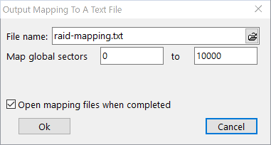 You can write the mapping of a chosen RAID topology into a text file. Click on Mapping on the bottom. Confirm the file name and the number of sectors in the following dialog: