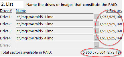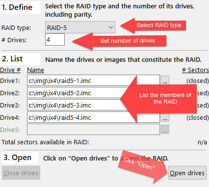Select RAID-5 as the RAID type, Set # Drives to 4, Enter the names of the image files into the fields labeled Drive1, Drive2, Drive3, and Drive4: