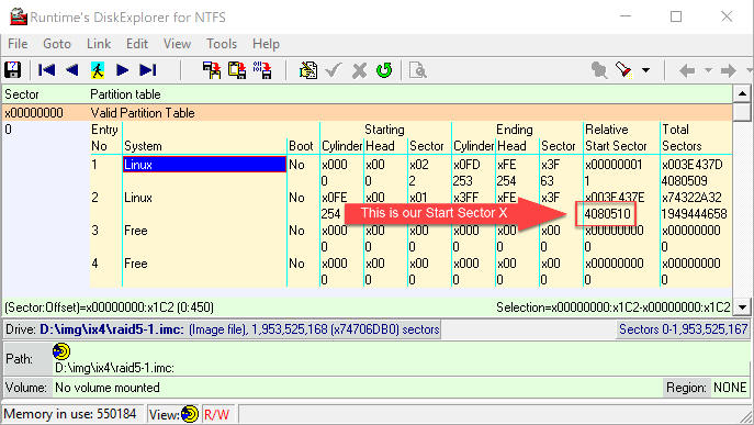 The first partition is most likely the small Linux OS partition with 2 GB, while the second partition appears to be a large 1 TB partition. It begins at sector 4,080,510 which is our start sector X.