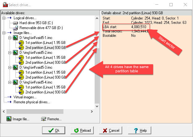 All member drives of the NAS have the same partition table with the large partition being the partition used to build the RAID-5. That partition starts at sector 4,080,510 on all drives.