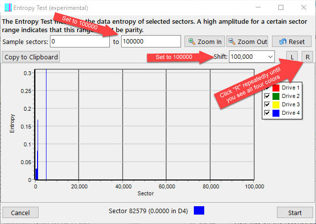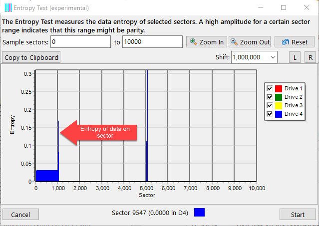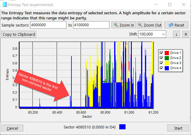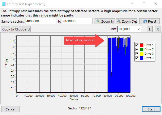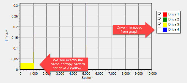 The graph shows the entropy (between 0 and 1) of the sectors 0..10,000 on the drives. The drives are displayed over each other. First drawn is drive 1 in red, followed by drive 2 (green), drive 3 (yellow), and drive 4 (blue). We know this area on the drives is mirrored over all drives, so the blue from drive 4 covers the other drives. Let's remove drive 4 by un-checking the checkbox to the left of the blue square followed by "Drive 4".