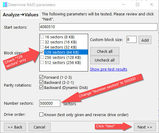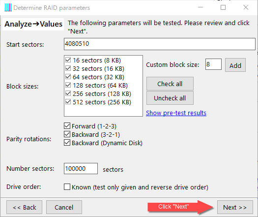 Also, leave the Block size and the Parity rotation unchanged. These values will be determined by the analysis we are going to start.