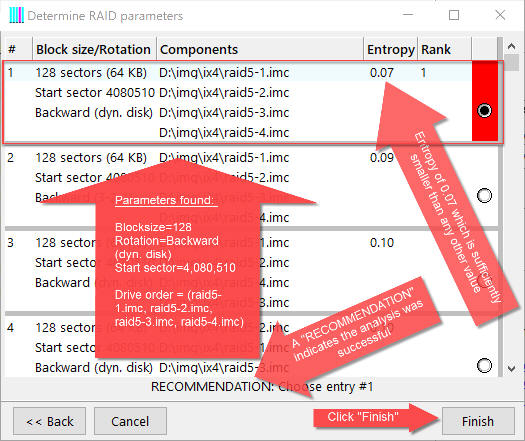 Unfortunately, we do not get a "Recommended entry". The best entry has an entropy of 0.15 while the next best has one of 0.16. The difference is less than the required threshold of 20%. However, we see all competing entries have a block size of 128. Let's go back to the previous screen and check block size 128 only. This will reduce the time needed for testing all combinations. Increase the value of "Number sectors" to 500,000.