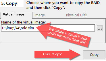 Now we are ready to copy the combined array to a virtual image file. Specify a target file name and click Copy.