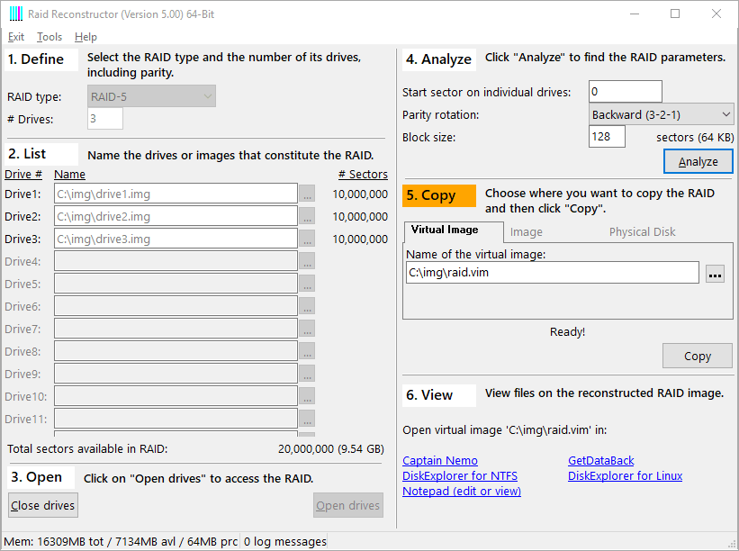 RAID Reconstructor de escritorio: Seleccione «RAID-5», 3 unidades, drive1.img, drive2.img y drive3.img.
