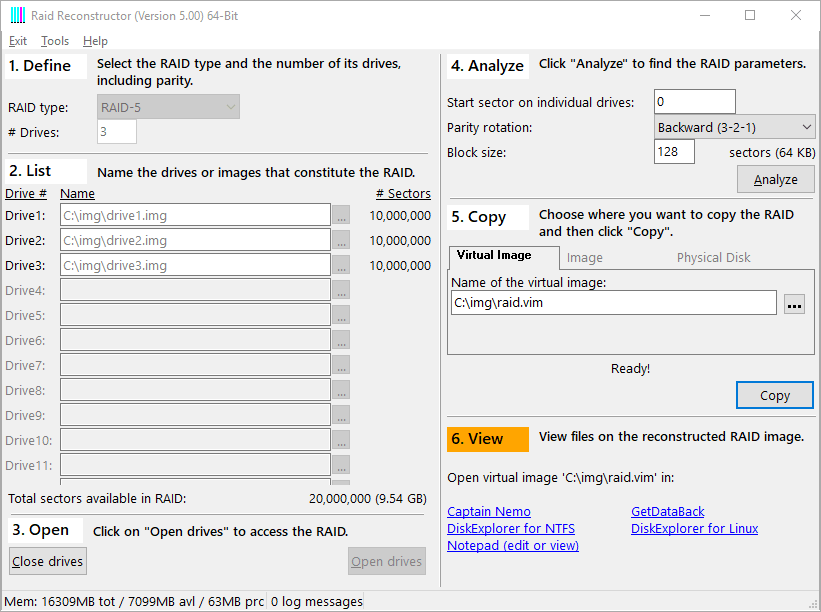 RAID Reconstructor Desktop : Choisissez « RAID-5 », 3 disques, drive1.img, drive2.img et drive3.img.